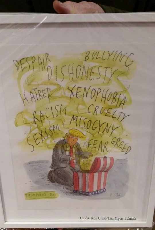 Trick question. You can do both at ARTRUMPS: Resistance and Action, which opens (on purpose) on April Fool's Day. Work by artists around the world is up for sale, including the work of Roz Chast, cartoonist for the New Yorker magazine.