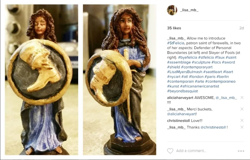 She bears a sword, plus a shield emblazoned with seven-league boots -- appropriate for the patron saint of farewells. Next step: I'm going to set (each of) her on a pedestal and connect her to her "halo."